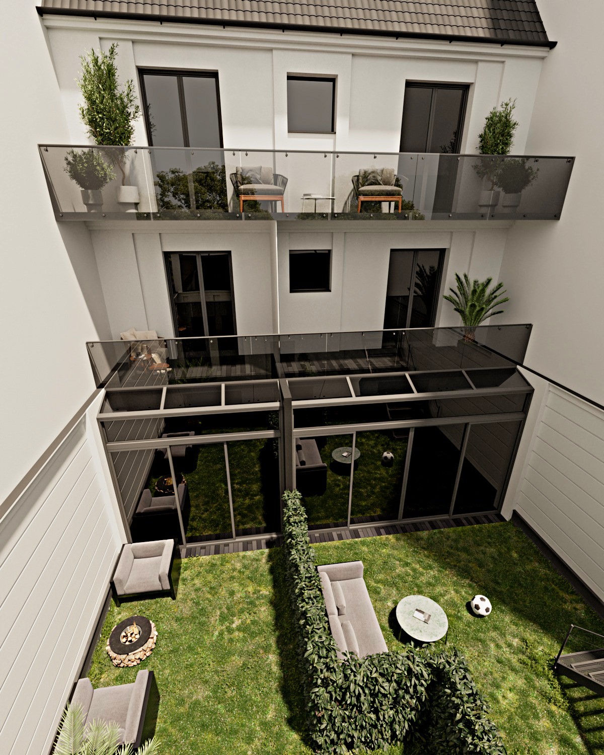 •Terrasse: großzügig und sonnig – mit Blick in den ruhigen Innenhof